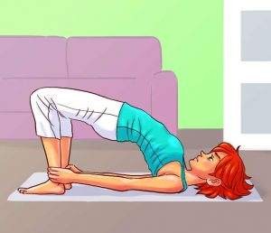 Instrukcje: Połóż się na plecach, ugnij nogi w kolanach, delikatnie rozstaw nogi i połóż ręce wzdłuż ciała. Podnieś miednicę i zegnij plecy bez podnoszenia ramion, szyi lub głowy z podłogi. Czas: 1 minuta. Efekt: Zlikwiduj ból pleców, wzmocnij brzuch, zmniejsz tkankę tłuszczową w talii i poprawij trawienie.