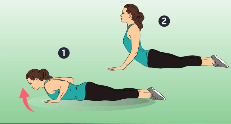 Leżymy twarzą w dół, ręce zgięte w łokciach, dłonie przyciśnięte do podłoża, tak że głowa jest lekko uniesiona. Z tej pozycji powoli staramy się maksymalnie wyprostować – wyciągnij tułów – pozostajemy 2-5 sekund i wracamy do pozycji wyjściowej. Powtarzamy 30 razy z rzędu.