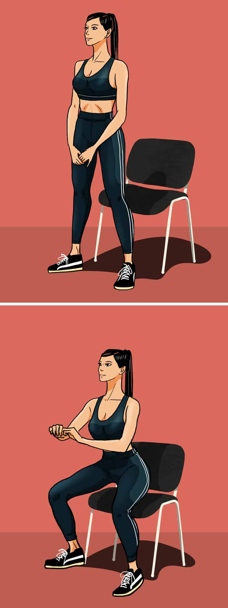 Dotknij krzesła (nie siadaj), a następnie wróć do pozycji wyjściowej. Początkujący mogą zacząć od 8 – 10 powtórzeń, później możesz powtórzyć ćwiczenie w 3 seriach po 10 – 12 powtórzeń.