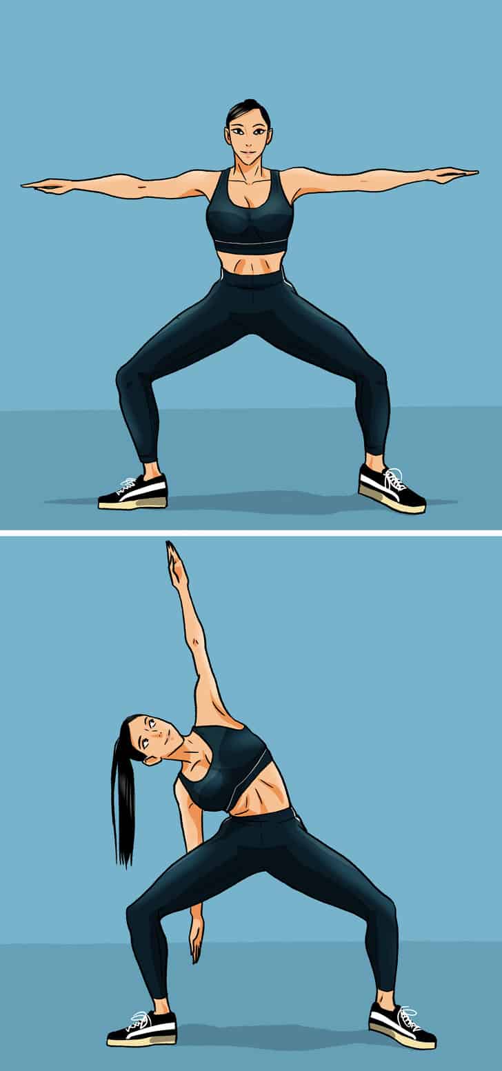 Zacznij „ciągnąć” ciało w prawo, zginając się w pasie, ale nie zginaj rąk. Kontynuuj pochylanie się na boki i dostosuj liczbę powtórzeń do swojej kondycji, z czasem zwiększając ich ilość.