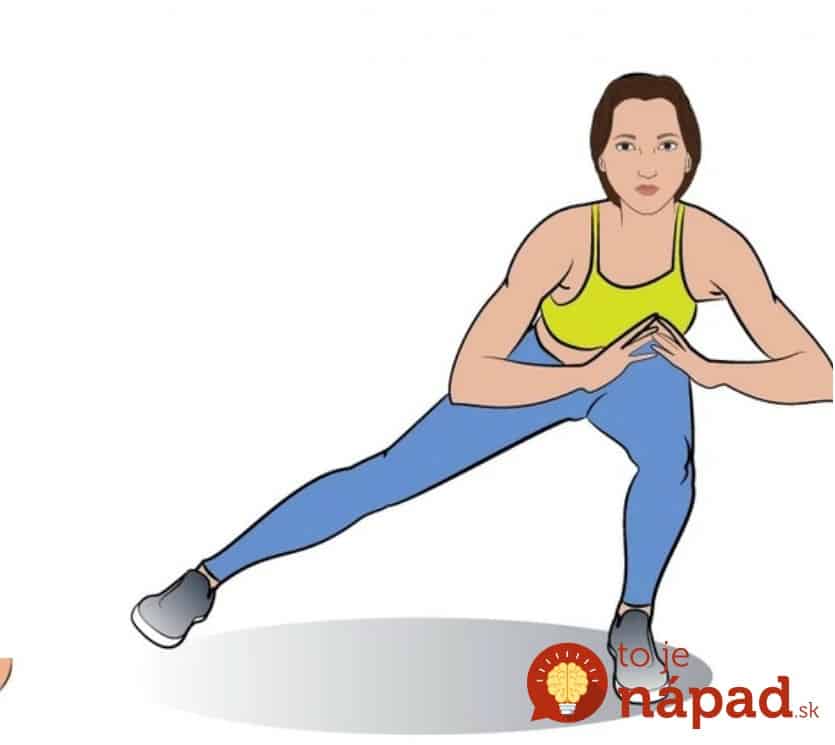 Nogi lekko w kolanach i dłonie razem z dłońmi pod brodą. Wchodząc na szerokość ramion w tej pozycji zawsze robimy krok najpierw w prawą stronę, potem z powrotem do pozycji wyjściowej i w lewą stronę. W ogóle nie ruszamy rękoma, a ciało powinno być cały czas lekko pochylone do przodu. Powtórz 10 razy z każdej strony