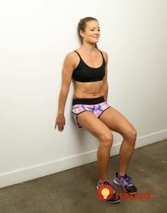Oprzyj plecy o ścianę w odległości 60 cm od niej. Zacznij poruszać się w dół, z powrotem do ściany, ugnij kolana do miejsca, w którym będą pod kątem 90 stopni. Przytrzymaj w przysiadzie przez 30 do 60 sekund i powtórz 2-3 razy.