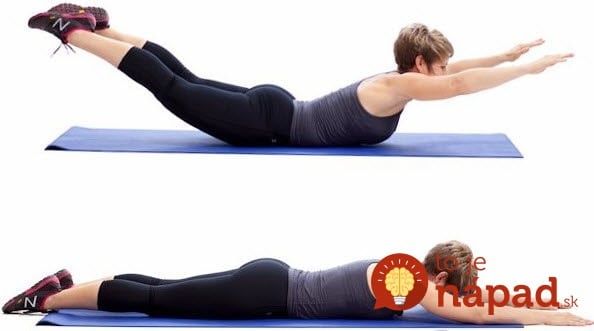 Ćwiczenie podobne do pływania na sucho. Po prostu podnosisz jednocześnie ręce i nogi. Powtórz 15 razy.