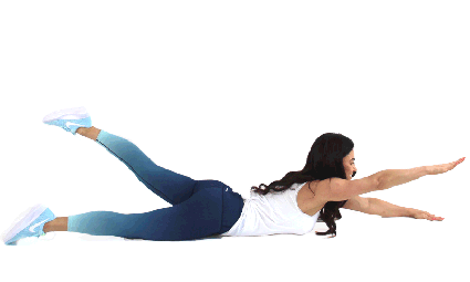 Połóż się twarzą do ziemi, połóż ręce przed sobą. Naprzemiennie podnoś lewą rękę – prawą nogę i odwrotnie. Pamiętaj o prawidłowym oddychaniu. Powtórz 30x – 15x dla każdej nogi.