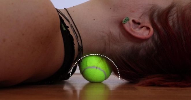 1. Połóż się na podłodze, twarzą skierowaną ku górze i ułóż 2 piłki tenisowe u podstawy czaszki.