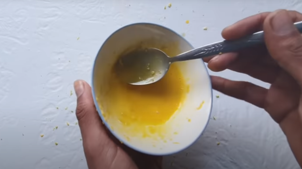 Najpierw zetrzemy skórkę z cytryny. Następnie kroimy i wyciskamy sok. Do miski wlać 2 łyżki soku z cytryny. Dodaj łyżkę skórki z cytryny. Jajka ubić widelcem w osobnej misce. Dodaj 3 łyżki stołowe do przygotowanej mieszanki cytryny. Na koniec dodaj 3 krople witaminy E. Dobrze wymieszaj.