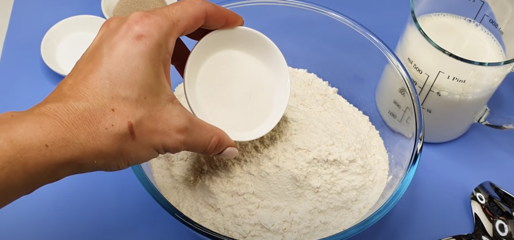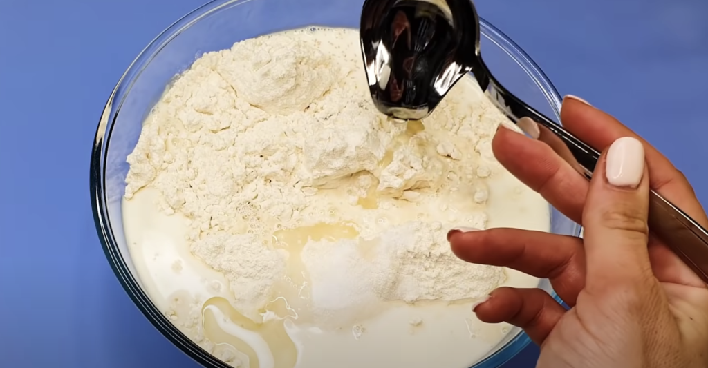 Rozpuść drożdże i 1 łyżkę cukru w ciepłym mleku o temperaturze pokojowej, a następnie dodaj do miski z mąką. Dodaj olej i dobrze wymieszaj.