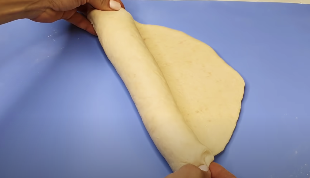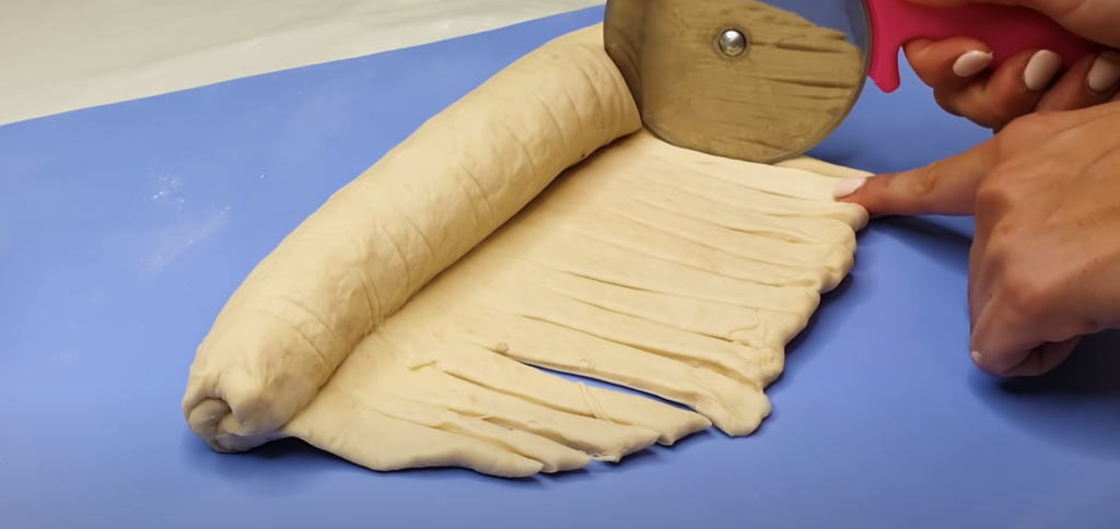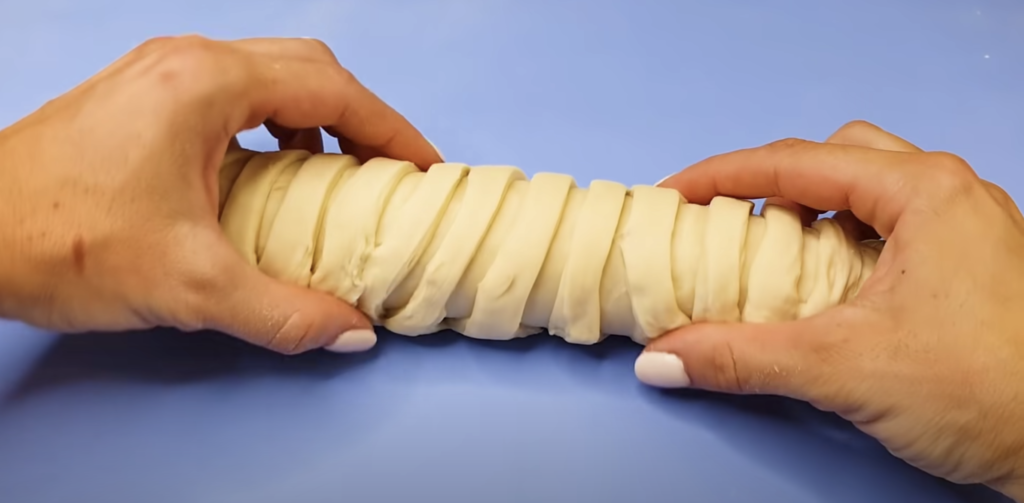 Podziel ciasto na dwie części. Z jednej części uformuj owalny bochenek, a z reszty uformuj płaski placek. Pokrój placek w paski i ułóż je na bochenku, owijając wokół.