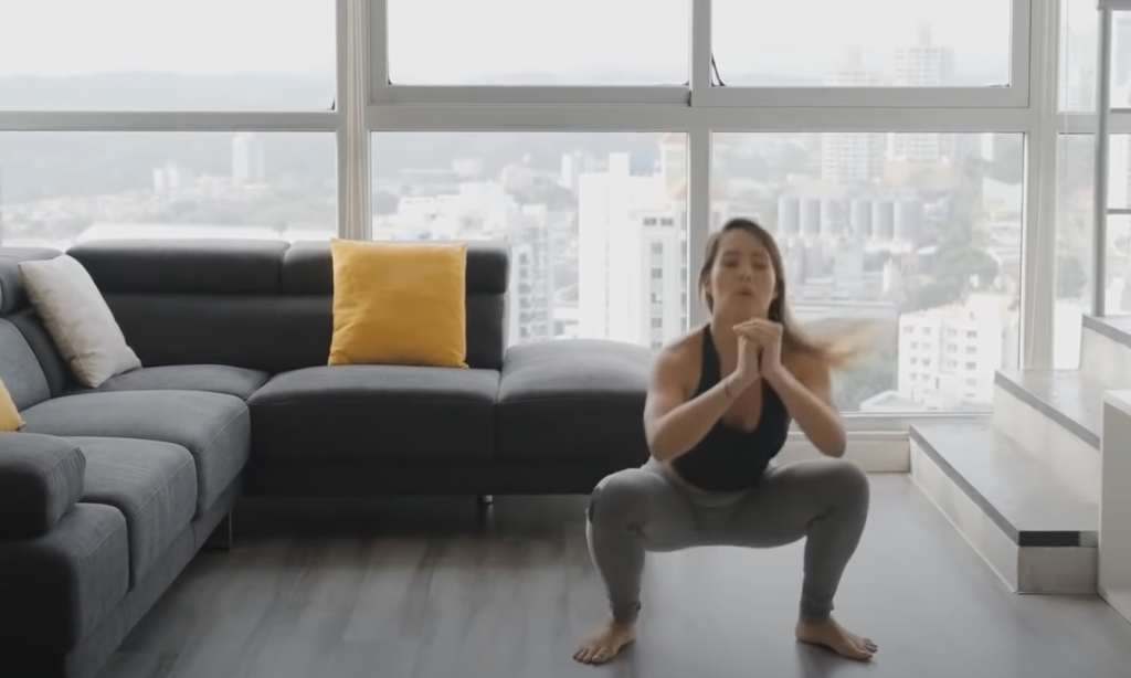 Przysiad z wyskokiem. Zrób przysiad, ciężar przenieś na pięty, pociągnij tyłek w dół, a następnie podciągnij ciało do skoku. Powtarzaj w tempie przez 30 sekund.