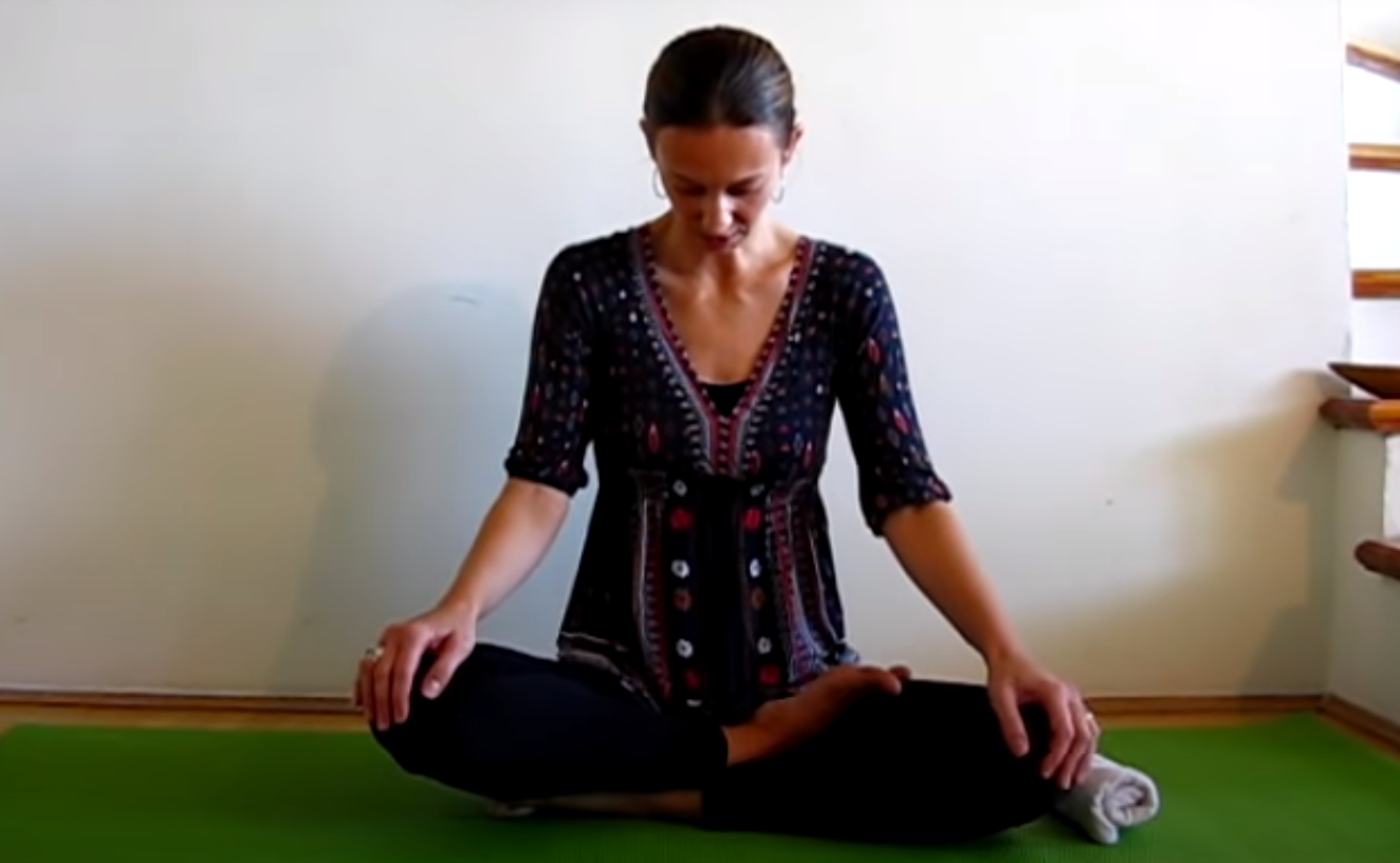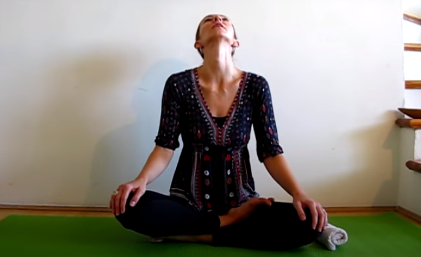 Usiądź na macie po turecku, swobodnie połóż dłonie na kolanach, wyprostuj plecy. Podczas wdechu powoli odchylaj głowę jak najdalej do tyłu, podczas wydechu do przodu. Powtórz 5 do 10 razy.
