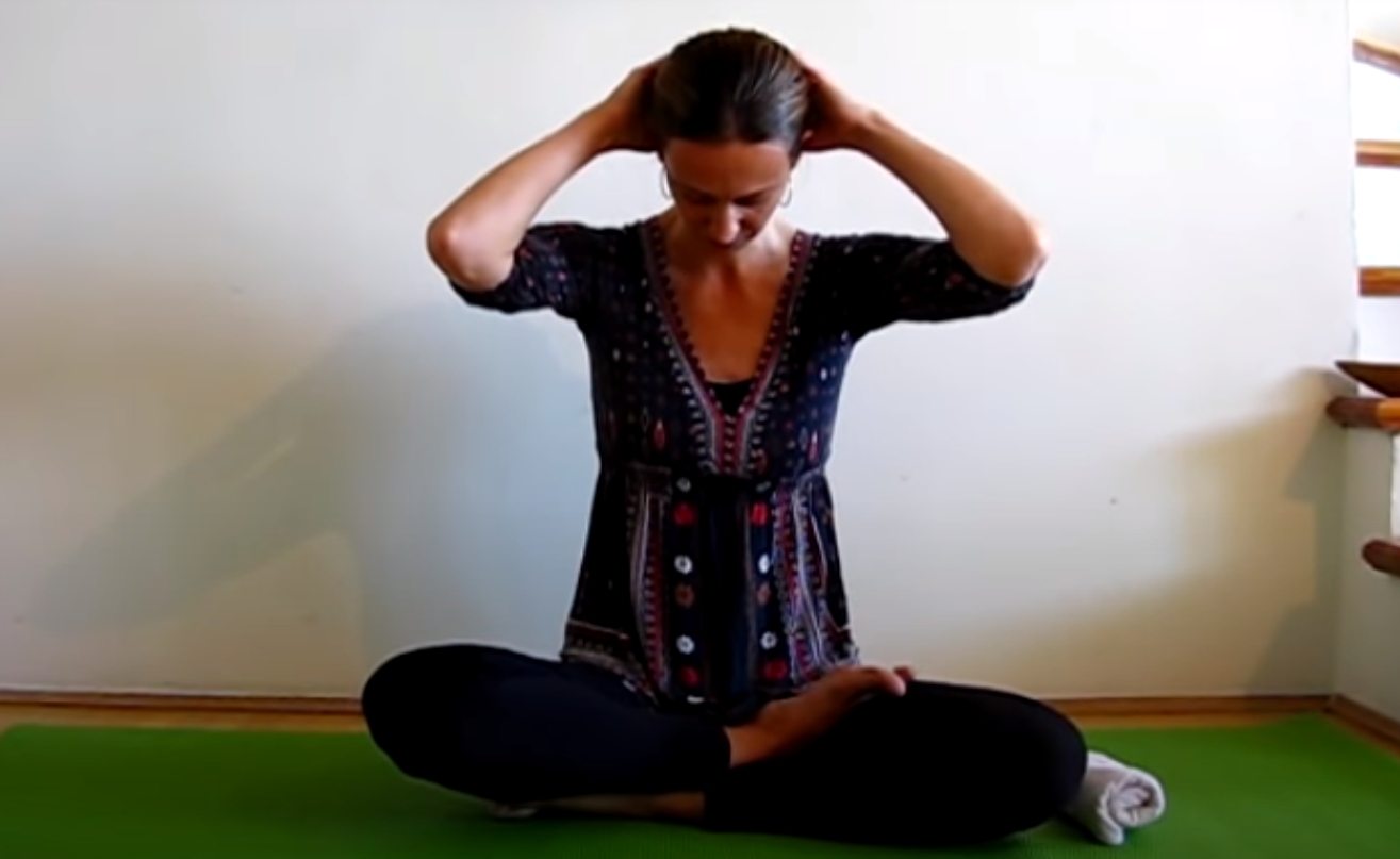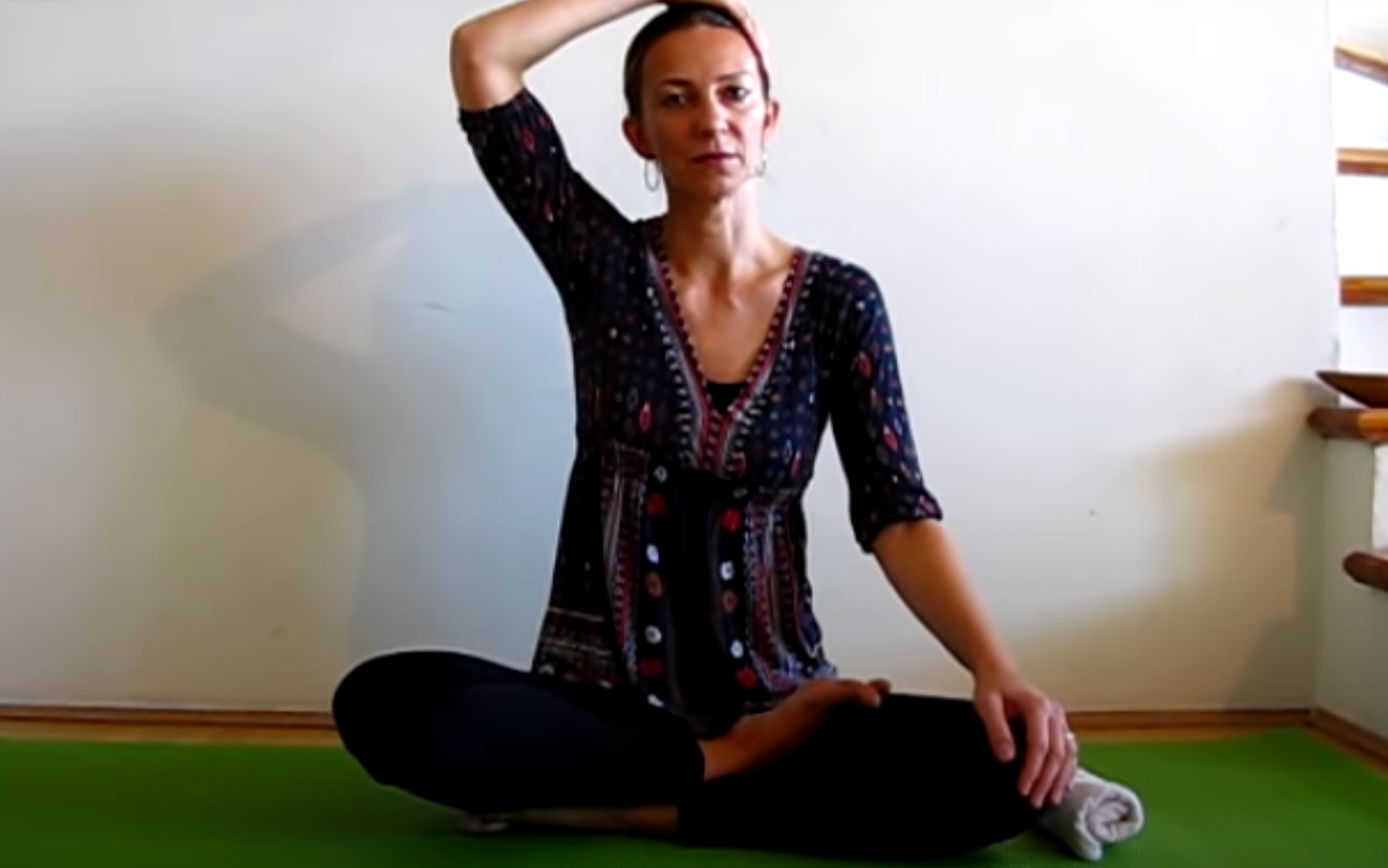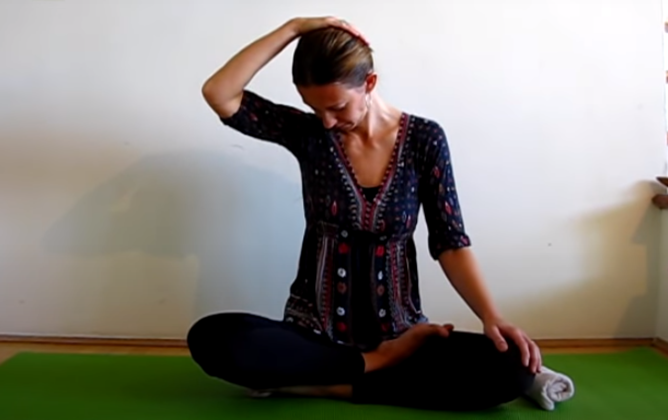 Pozostań w pozycji i podnieś prawą rękę i połóż dłoń na skroni po przeciwnej stronie. Zrób głęboki wydech z głową w dłoni. Powtórz około 5 razy. Z kolejnym wydechem powoli przechyl głowę w kierunku prawego ramienia.