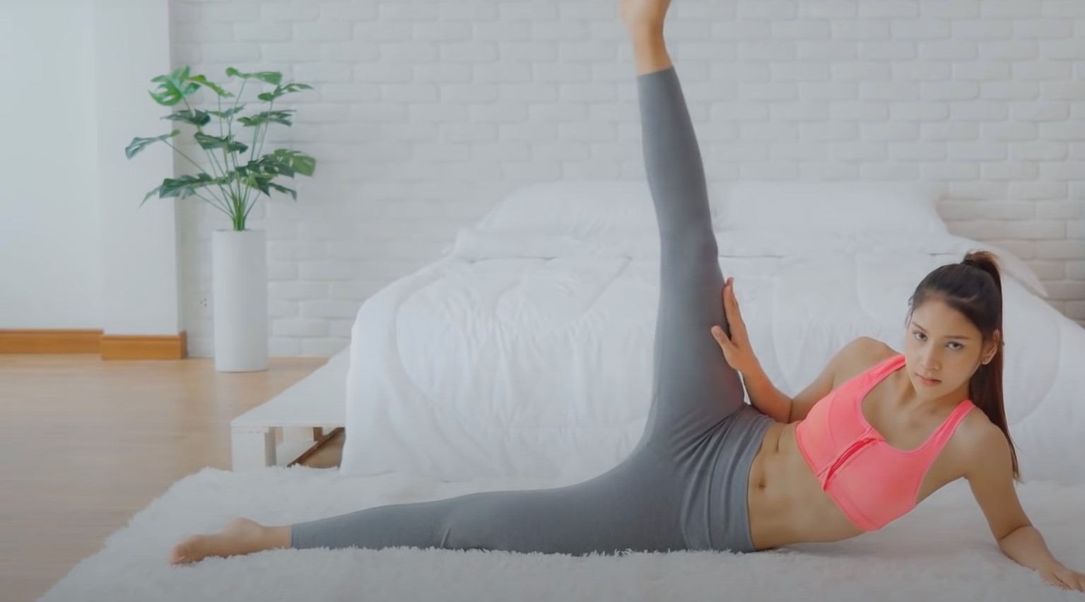 Połóż się na boku, oprzyj się na łokciu, wyciągnij nogi i podnieś jedną nogę jak najwyżej. Powtarzaj przez 30 sekund z jednej lub drugiej strony.