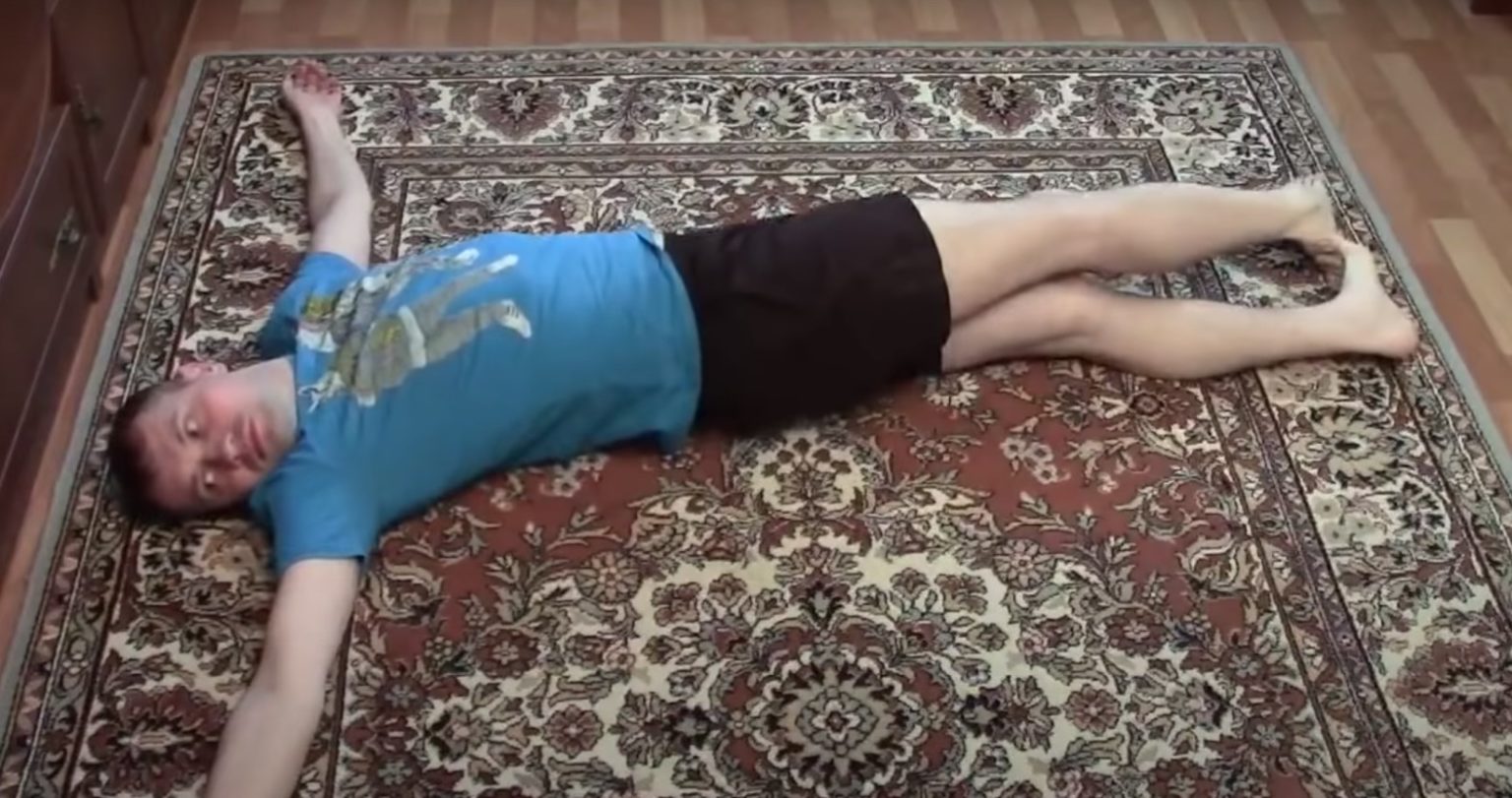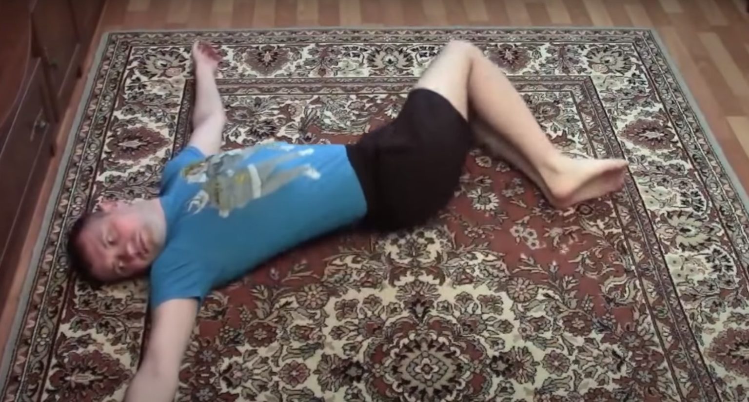 Połóż się na macie, rozłóż ręce na ziemi, zegnij kolana. Ostrożnie odciągnij kolana na jedną stronę i odwróć głowę na drugą stronę. Powtórz razem 20 razy.