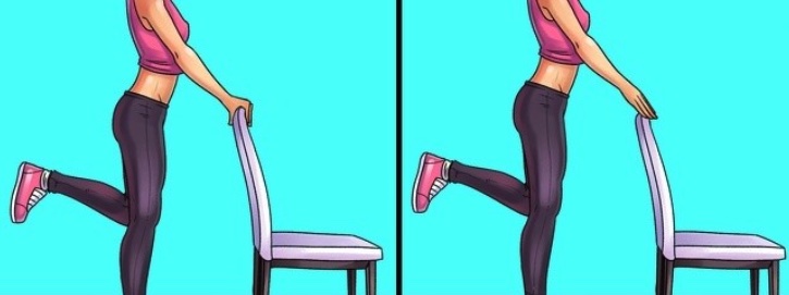 Stań za krzesłem i złap je obiema rękami. Zegnij jedną nogę w kolanie i unieś tak, aby łydka i udo były ułożone pod kątem prostym. Powoli unieś kostkę drugiej nogi, aż ciężar będzie całkowicie przeniesione na palce. Wraz z kostką unieś również dłonie w taki sposób, aby palce były praktycznie wyprostowane.
