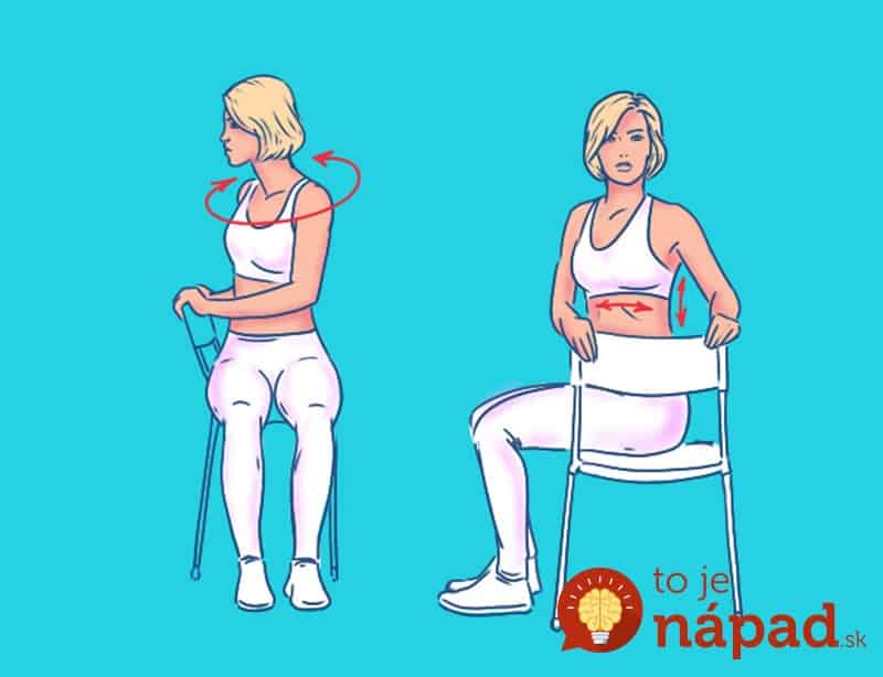 Usiądź na krześle tak, aby stopy mocno opierały się o podłogę. Wyprostuj plecy, odwróć ramiona na bok, upewniając się, że reszta ciała pozostaje nieruchoma. Przytrzymaj przez 30 sekund i wykonaj 5 cykli głębokiego oddychania. Powtórz to trzy razy na każdą stronę.