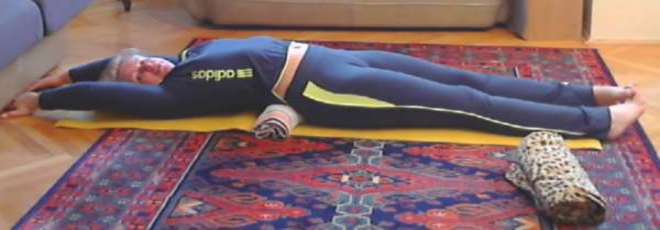 Gdy jesteś już w prawidłowej pozycji, wyprostuj nogi i delikatnie rozsuń na szerokość ramion. Ręce wyciągnij za głowę, a dłonie obróć tak, aby były skierowane spodem do podłoża, a małe palce stykały się. Ćwiczenie może na początku być trochę bolesne, ale staraj się utrzymać tę pozycję przez 5 minut – za każdym razem będzie coraz łatwiej.
