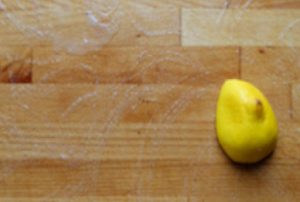 Po obfitym posypaniu deski do krojenia solą morską, natrzyj ją połówką cytryny. Po pozostawieniu deski na ok. 10-15 minut, ponownie natrzyj ją cytryną. Następnie można spłukać deskę wodą.