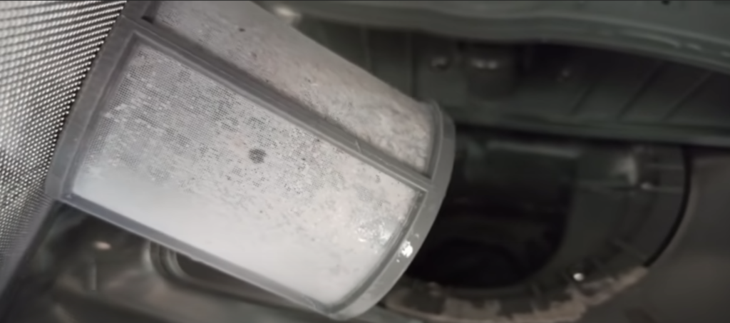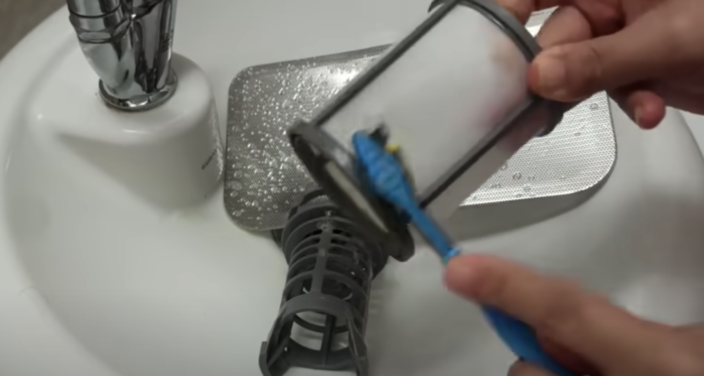 Wyjmujemy pokrywę filtra i sam filtr ze zmywarki. Są to zdejmowane części, które zwykle łatwo się wyciąga i stają się najbardziej zanieczyszczone podczas normalnej pracy zmywarki.