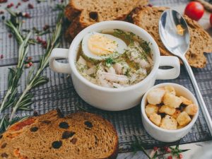 Wyjmij mięso z garnka i pokrój je na małe kawałki. Dodaj je do wywaru. Ugotuj jajko. Obrać jajko i przekroić je na pół. Dodaj zupę do miski. Dodaj jajko.