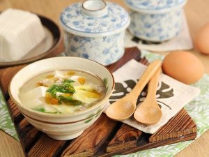 Do mięsa dodać bulion. Dodać sok z cytryny. Ugotować jajko. Należy je obrać i przekroić na pół. Z tofu uformować małe kostki. Dodaj zupę do miski. Dodaj ser i jajko.