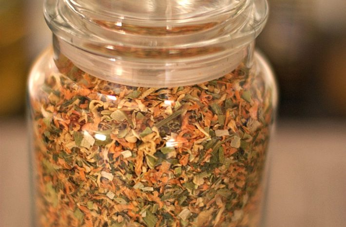 Pozwól marchewce, pietruszce i selerowi, jak również lubczykowi, powoli wyschnąć naturalnie na powietrzu i grzybom, tak jak jesteś do tego przyzwyczajony. Jeśli na zewnątrz jest gorąco, można je również suszyć w cieniu. Zmiel kulki czarnego pieprzu i ziela angielskiego i wymieszaj je z kurkumą. Suszone grzyby zmiel osobno na proszek.