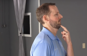 Stań prosto, przytrzymaj podbródek palcem wskazującym i środkowym i delikatnie odchyl głowę do tyłu. Odsuń głowę tak daleko, jak chcesz. Możesz powtórzyć ćwiczenie od 10 do 15 razy z rzędu lub pozostać w pozycji tylnej przez co najmniej 10 sekund i powtórzyć 5 razy.