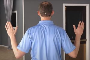 Stań prosto i połóż ręce w pozycji „W”, a następnie popchnij łokcie do tyłu i w dół. Uważaj, aby nie wypychać ramion do góry, lecz ściągać je w dół. Powinieneś czuć skurcze pośrodku pleców.