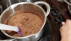 Wmieszaj miód do masła. Poczekaj, aż się rozpuści. Często mieszaj masę i trzymaj ją w zasięgu wzroku. Mieszanka nie powinna się zagotować! Wsyp cukier i dalej gotuj, aż całkowicie się rozpuści. Wsypać kakao w proszku i dobrze wymieszać.
