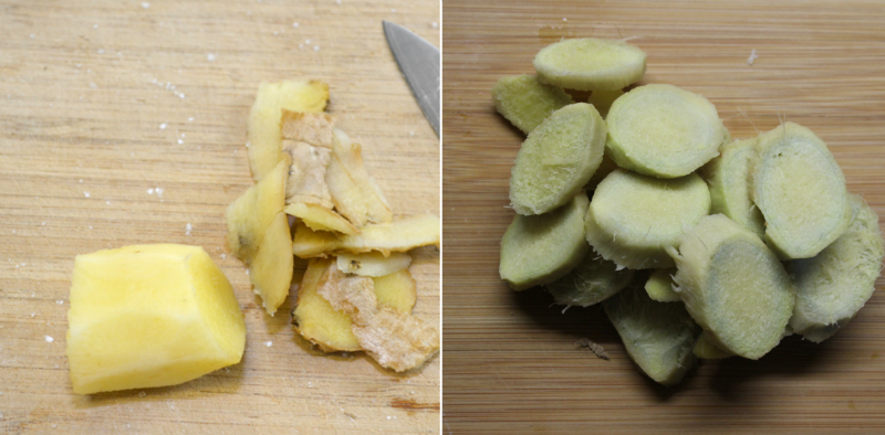 Imbir umyć i obrać. Pokrój korzeń w pierścienie o grubości 0,3-0,5 mm.