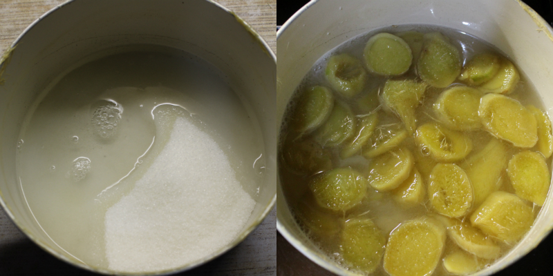 Do wody, w której był gotowany imbir, dodaj cukier. Mieszaj do całkowitego rozpuszczenia, a następnie zanurz ponownie kawałki imbiru w syropie. Gotuj na minimalnym ogniu przez 40 minut.