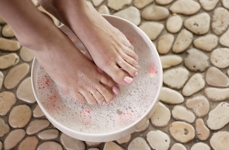 Aby maksymalnie oczyścić skórę, rozcieńcz 2 łyżki sody, 2 łyżki płatków mydlanych na 3 litry ciepłej wody. Trzymaj stopy w miksturze przez 10 minut.