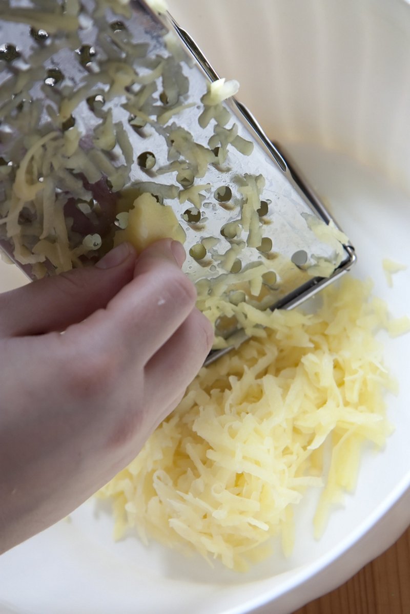 Następnym elementem przygotowania dania jest obranie i starcie ziemniaków na tarce o grubych oczkach. Dalej dodaj mięso mielone i smaż do momentu, aż ziemniaki będą na pół miękkie. Dodaj pieprz, sól do wedle uznania.