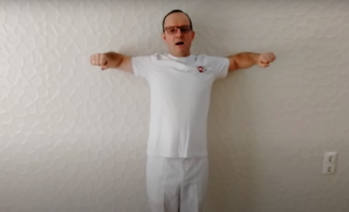 Stań pod ścianą tyłem i odsuń się od niej ( o mały krok). Oprzyj ramiona i łopatki o ścianę. Ułóż dłonie pod odpowiednim kątem, aby wszędzie był kąt prosty – ciało z dłońmi, nawet przy łokciach. Podczas wydechu wepchnij łokcie w ścianę. Powtórz 15 do 20 razy.