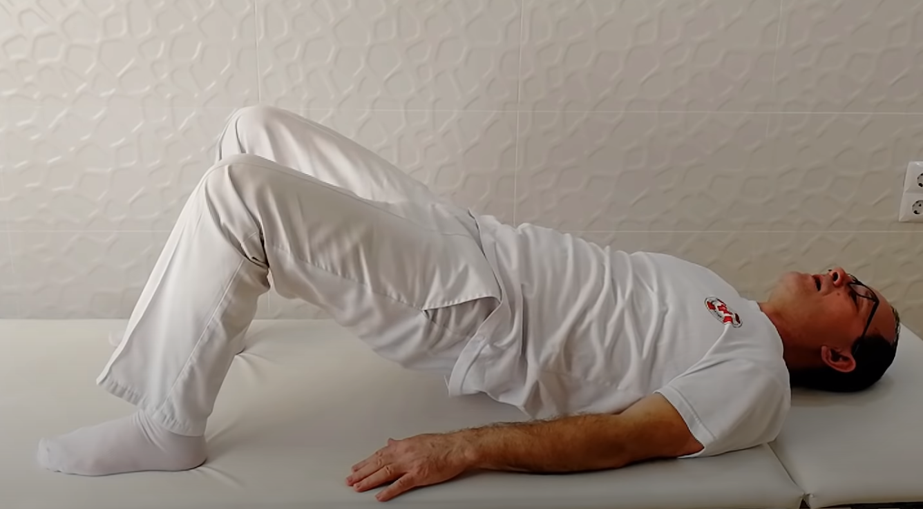 To ćwiczenie można wykonywać na kanapie lub na podłodze i jest również odpowiednie w przypadku ostrego bólu. Połóż się na plecach, ugnij nogi w kolanach i połóż ręce blisko miednicy. Podczas wydechu staraj się maksymalnie unieść miednicę.