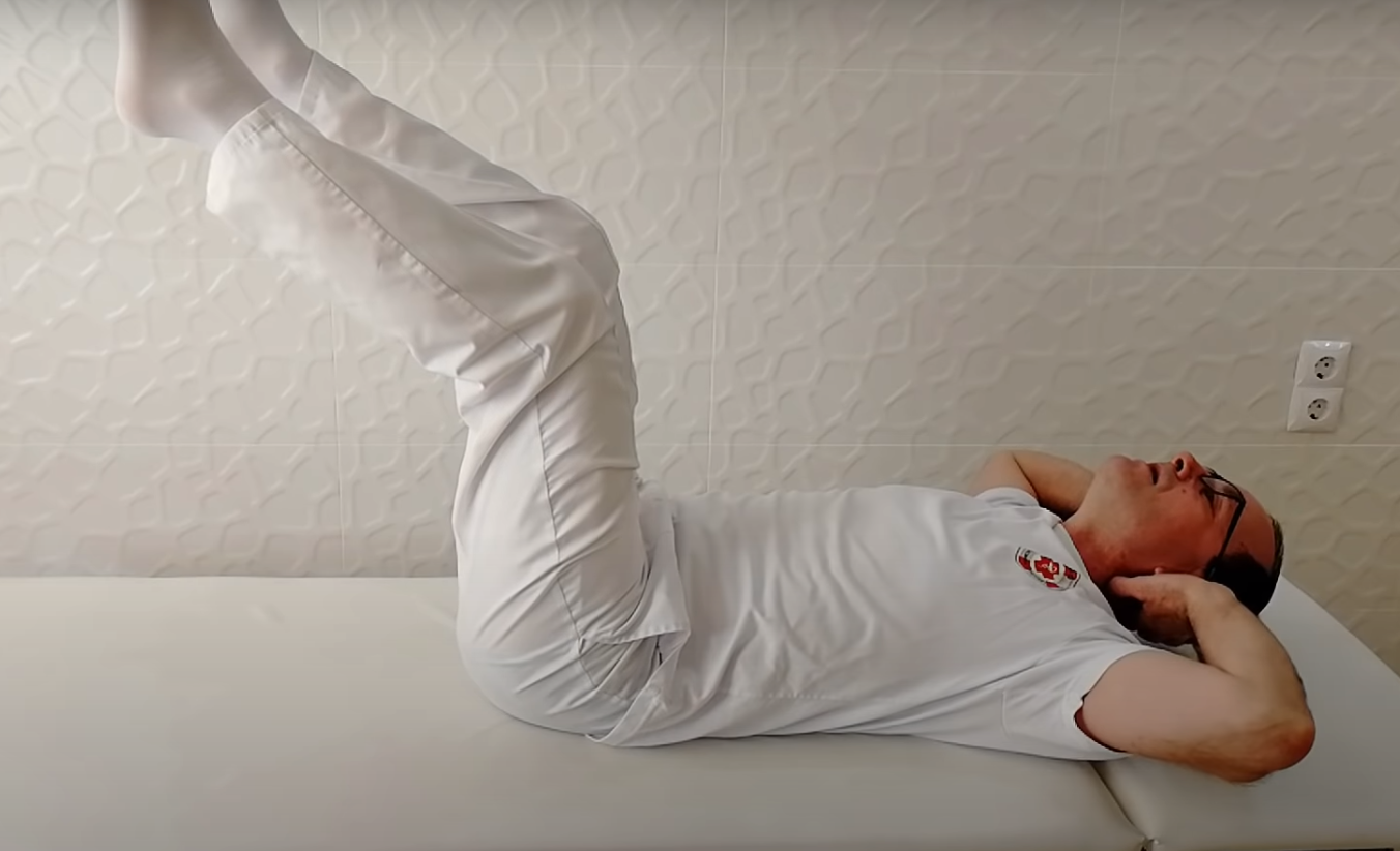 To ćwiczenie jest najskuteczniejsze w przypadku bólu krzyża. Zegnij nogi w kolanach i, jeśli to możliwe, połóż je na stołku lub innym podwyższonym miejscu. Załóż ręce za głowę. Podczas wydechu unieś podbródek o 5 do 10 centymetrów bez zginania szyi.