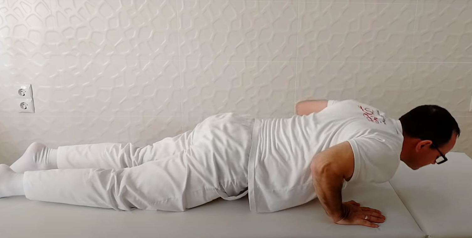 W następnym ćwiczeniu połóż się na brzuch i zbliż się do ciała w okolicy klatki piersiowej, a następnie odsuń ręce od maty i podciągnij pośladki do pięt. Dla tych, którzy nie wiedzą, jak wykonać ten ruch, istnieje również wersja uproszczona.