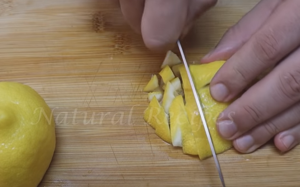 Następnie pokrój skórkę z cytryny na małe kawałki. Włóż do miski.