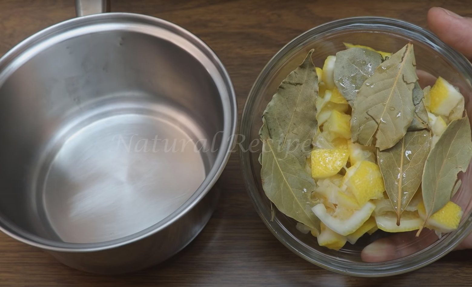 Teraz weźmy 6 liści laurowych. Razem z pokrojoną skórką z cytryny włożyć do garnka.
