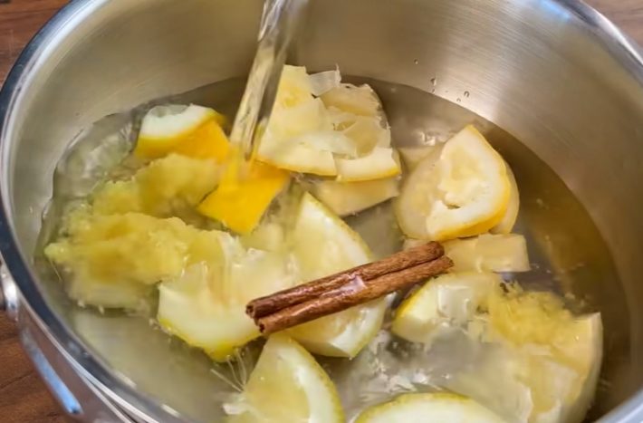 Umytą cytrynę przekroić na pół i wycisnąć z nich cały sok. Pozostałe części cytryny pokroić na mniejsze kawałki i wrzucić do garnka. Obierz kawałek imbiru, zetrzyj go na grubej tarce i dodaj do garnka z cytryną. Dodaj laskę cynamonu, wodę i postaw garnek na kuchence.