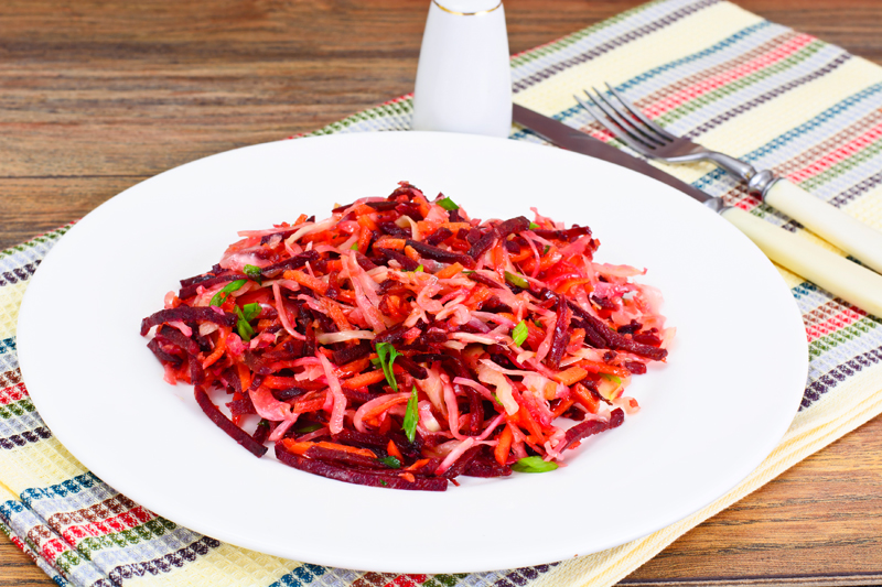 Zetrzyj na tarce obrane wcześniej buraki, marchewkę i jabłko. Posiekaj kapustę, cebulę pokrój w piórka. Wymieszaj wszystko, następnie dodaj ocet, olej roślinny i dopraw solą wedle uznania.
