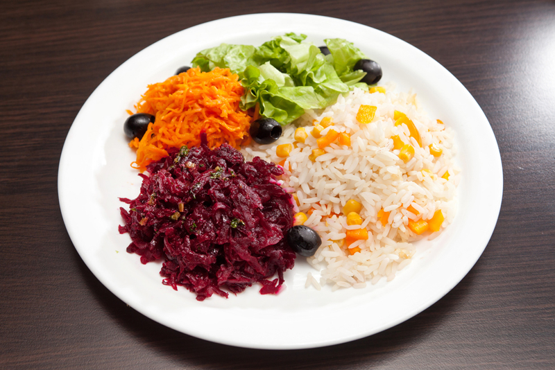 ugotowany burak, marchewka oraz ryż (150 g), łyżka kukurydzy z puszki, osiem oliwek, łyżka oliwy z oliwek, łyżeczka sosu sojowego oraz pół łyżeczki octu jabłkowego i świeże zioła