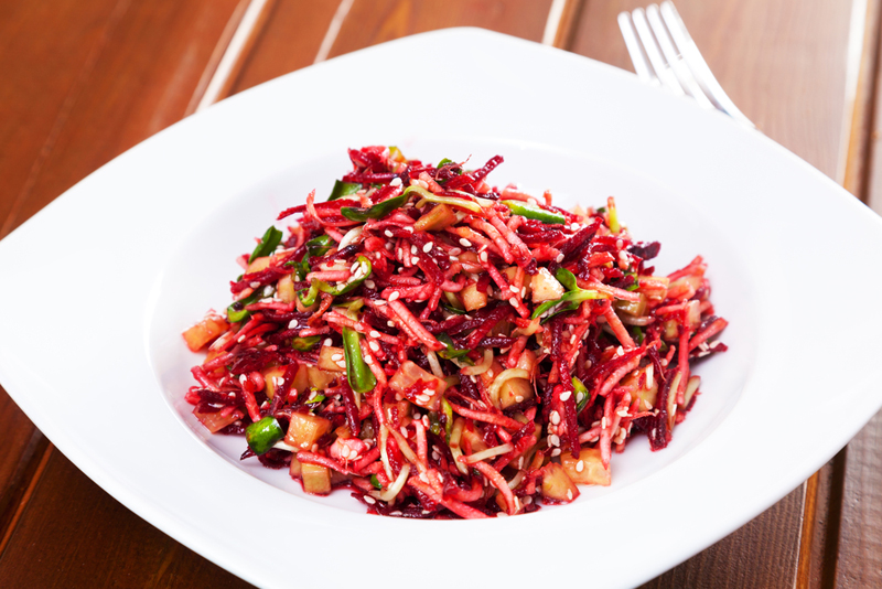 Startą marchew, seler i buraka oraz drobno poszatkowaną kapustę wymieszaj z posiekanymi ziołami. Całość skrop sokiem z cytryny i olejem roślinnym, posyp sezamem i dopraw do smaku solą.