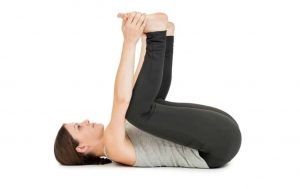 Połóż się na plecach, ugnij nogi i chwyć palce u nóg. Delikatnie ściągnij kolana i połóż je na ziemi obok klatki piersiowej. Ta pozycja przypomina dziecko bawiące się nogami. Jeśli nie możesz chwycić palców u nóg, spróbuj chwycić za kostki. Utrzymaj pozycję przez co najmniej pół minuty.