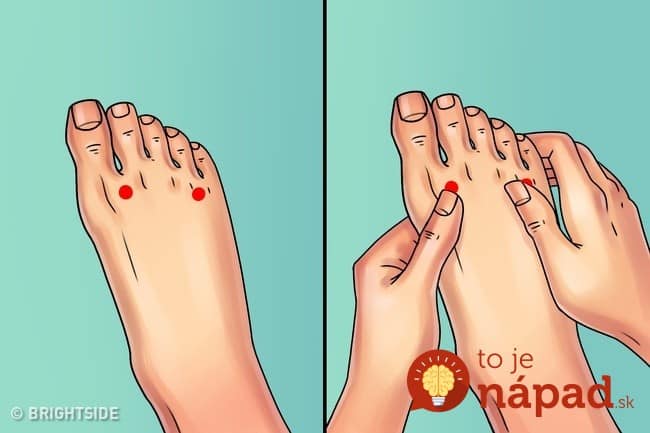 Jeśli po długim dniu bolą Cię stopy, połóż dwa kciuki na punktach na stopach, które widzisz na zdjęciu (między palcami 1 i 2, 4 i 5). Delikatnie masuj je przez 10 do 15 minut. w ciągu kilku sekund poczujesz, że znalazłeś właściwe miejsce.