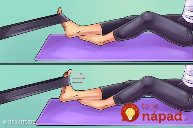 Będziemy potrzebować elastycznej tkaniny, którą zamocujemy wokół solidnego mebla. Zegnij lekko jedną nogę w kolanie i umieść ją pod drugą nogą. Załóż pasek na wyższą nogę i stopą powoli pociągnij pasek do siebie. Powtórz 10-15 razy dla każdej nogi. Ćwiczenie wzmacnia mięśnie łydek i wewnętrznej strony ud, które są ważne dla wspierania stawów nóg.