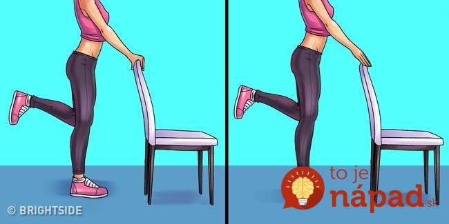 Stań za wezgłowiem krzesła i chwyć je obiema rękami. Zegnij jedną nogę w kolanie i unieś ją tak, aby łydka i udo utworzyły kąt ostry. Powoli unieś kostkę drugiej nogi, aż staniesz na palcach. W tym samym czasie, co kostka, podnosimy również dłonie, tak aby palce były prawie na poziomie. Powoli przywracamy piętę z powrotem na podłogę. Powtórz 10-15 razy dla każdej nogi. Ćwiczenie to działa przeciwbólowo i systematycznie wzmacnia kolano oraz otaczające go mięśnie.