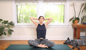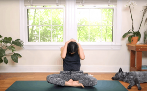 Następnie zrób wydech, ponownie przyciągnij brodę do klatki piersiowej, ale bądź ostrożny! Nie pchaj głowy rękoma za głowę. Po prostu pozwól grawitacji działać i wykonaj naturalny ruch, który sprawi, że plecy będą się kołysać, a łokcie prawie się połączą. Zamknij oczy i oddychaj.