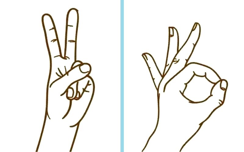 Zrób znak zwycięstwa „V” palcami prawej ręki, a lewą ręką znak „OK”.
