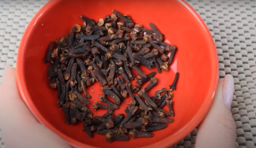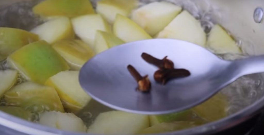 Umyj jabłko, usuń rdzeń i pokrój w drobną kostkę razem ze skórką. Kawałki jabłek włożyć do małego garnka, zalać wodą i zagotować. Następnie dodać goździki, pozostawić do zaparzenia i lekko ostudzić.