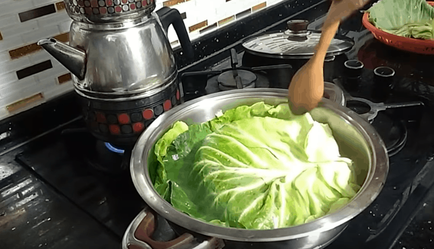 W garnku zagotuj wodę, gdy się zagotuje, włóż do niej liście kapusty tak, aby były zanurzone.